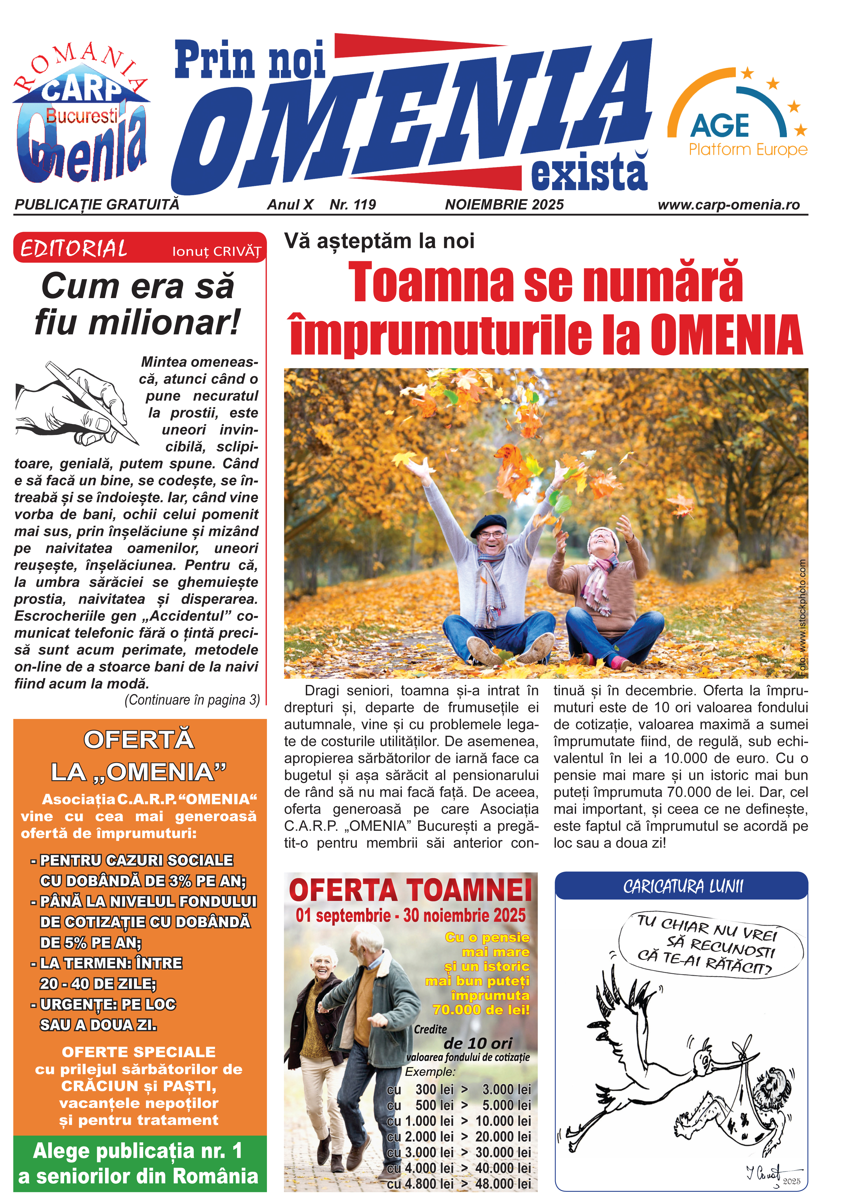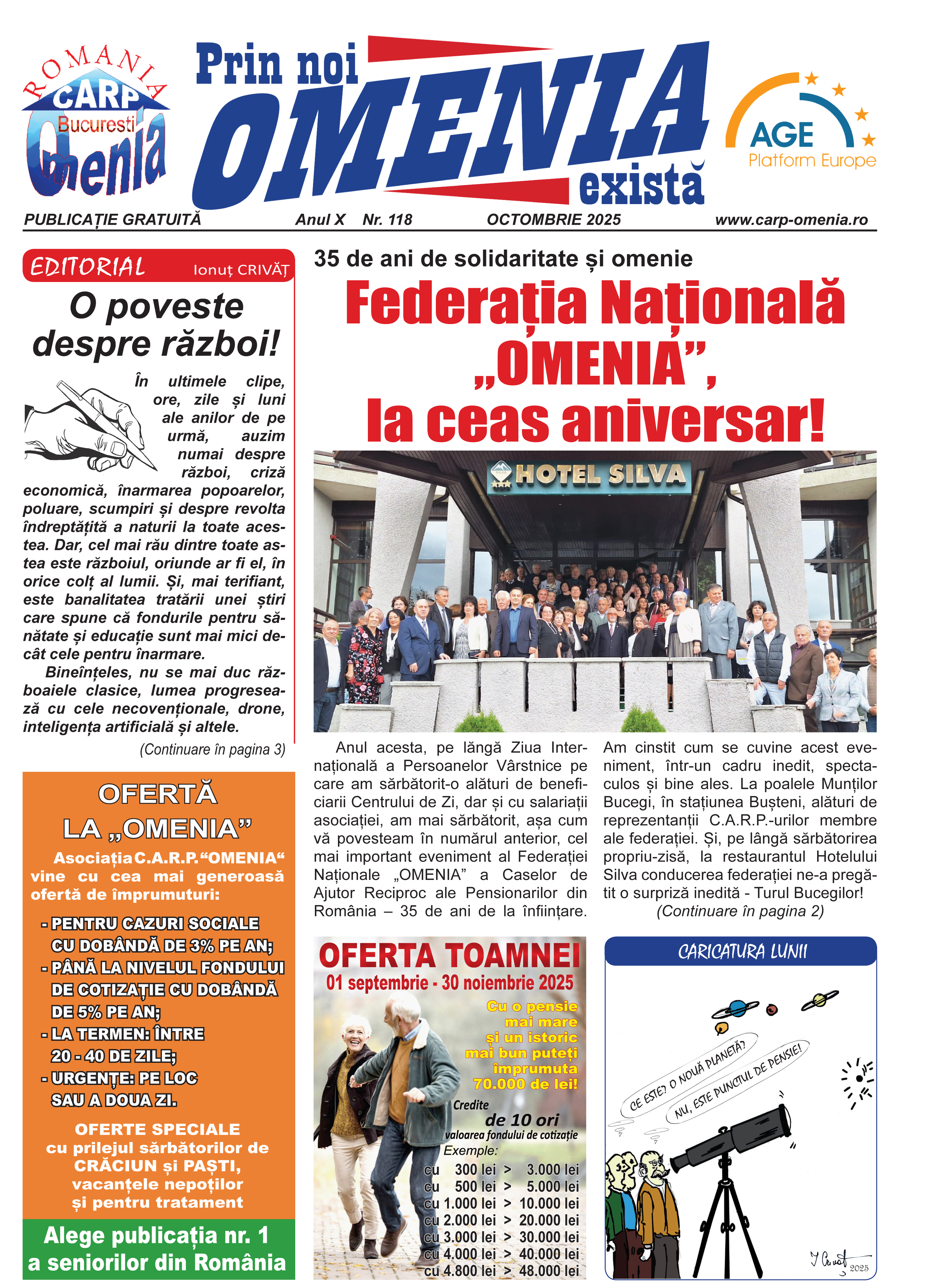 Publicația numărul 1 a seniorilor din România, “Prin noi OMENIA există”, cu un tiraj record de peste 20.000 de exemplare, sosește lună de lună în casele dumneavoastră și în varianta on-line. Subiectele sunt variate, articol de fond, interviu, reportaj, analiză, informații despre activitatea de creditare și socio-umanitară a Asociației C.A.R.P. “OMENIA” București, problematica persoanelor vârstnice la zi și multe altele, foarte interesante.
