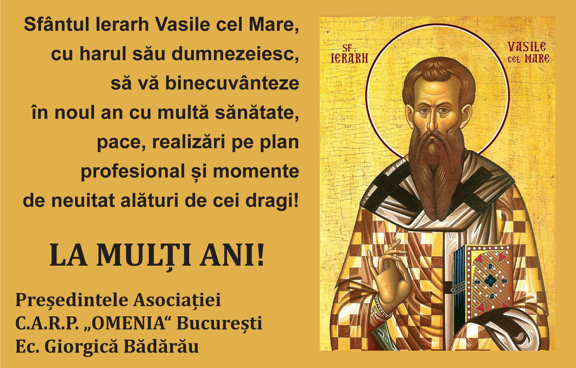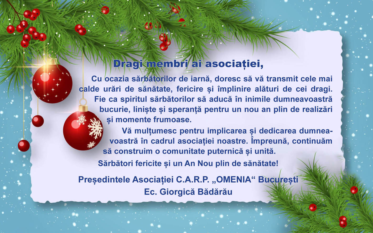 Mesajul domnului ec. Giorgică Bădărău, președintele Asociației C.A.R.P. „OMENIA” București, cu prilejul sărbătorilor de iarnăcarpomen2024-12-19T06:11:06+00:0019/12/2024|